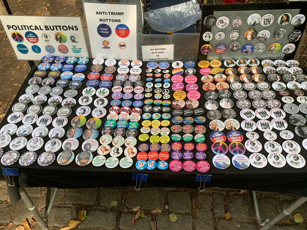 Es reicht erst einmal. Ich brauche einige Tage kulturelle Diät. Stattdessen versuche ich im Laufe der Woche einige Empfehlungen abzuarbeiten, die mir Menschen mit auf den Weg nach New York gegeben haben. Bei Gray´s Papaya gibt´s Hot Dogs, die Schlange vor Apollo Bagels ist mir zu lang, im Strand Book Store bin ich zu lange und kaufe unvernünftigerweise mehrere Bücher, von denen ich nicht weiß, wie ich sie jemals zurück nach Europa schaffen soll. Bemerkenswert vielleicht noch die Strawberry Fields im Central Park. Da geht es doch wieder um Musik. Alle, die wollen, dürfen sich dort mit einer Gitarre hinstellen und Beatles-Songs singen, unabhängig vom Talent, habe ich den Eindruck. Die Touristen machen Fotos. An einem Stand gibt es John Lennon-T-Shirts. Ich bleibe standhaft und schaue mir die gemischte Auslage mit kleinen Buttons an, darunter nicht nur John Lennon, sondern auch Harris und Walz. Ich entscheide mich, nicht aktiv in den Wahlkampf einzugreifen, sondern diesen Blog weiterhin als neutraler Beobachter zu schreiben. Interessant dass es an diesem touristischen Ort keine Trump, sondern nur Anti-Trump Buttons gibt. Bei den Kappen und T-Shirts vor dem Apollo Theater herrschte überraschenderweise mehr politische Ausgewogenheit. Oder war das dort ironisch gemeint? Kann ich mir schwer vorstellen bei dem Thema – dafür ist es zu ernst. Im Washington Square Park gibt es übrigens auch nur Buttons mit Harris und Walz. Daneben ein Stand mit Tarot-Karten, an dem man sich die Zukunft vorhersagen lassen kann.