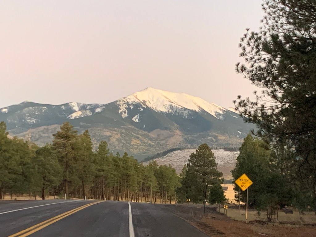 Das mit Arizona muss ich vielleicht kurz erklären. Auf Einladung einer Kollegin von der Northern Arizona University konnte ich meinen längeren USA-Aufenthalt dazu nutzen, einen Abstecher von New York nach Flagstaff machen. Ich hatte sofort zugesagt und erst beim Buchen des Fluges bemerkt, wie weit Arizona von der Ostküste entfernt ist. Eine Fernreise, in der Zeit hätte ich fast nach Europa zurückfliegen können. Für geographisch Unkundige, die – so ging es mir – noch nie von Flagstaff gehört haben: Die Stadt erreicht man von der Wüstenlandschaft um Phoenix mit ihren Kakteen und Palmen aus nach 2,5 Stunden Autofahrt Richtung Norden. Unterwegs versuchte ich Nat King Cole und einige andere Musiker zu einer kleinen Playlist zu versammeln, weil Flagstaff an der Route 66 liegt, auf 2.100 Metern Höhe in den Bergen. Nach meinem alpinen Verständnis von Gebirge handelt es sich allerdings eher um eine Art Hochebene. Die Stadt und die Natur drumherum sind bei Touristen äußerst beliebt. Es gibt Elche, Rentiere (viele, hab ich selbst gesehen) und angeblich Koyoten. Im Wanderführer, den ich mir gekauft habe, stand, dass man beim hiking auf Schlangen achtgeben soll. Tagsüber schien die Sonne und es wurde recht warm, aber morgens musste ich das Eis von der Windschutzscheibe kratzen und oben auf dem Humphreys Peak lag bereits erster Schnee. Das Ski-Gebiet ist auch deshalb beliebt, weil man von oben dieses große Tal hier sehen kann: