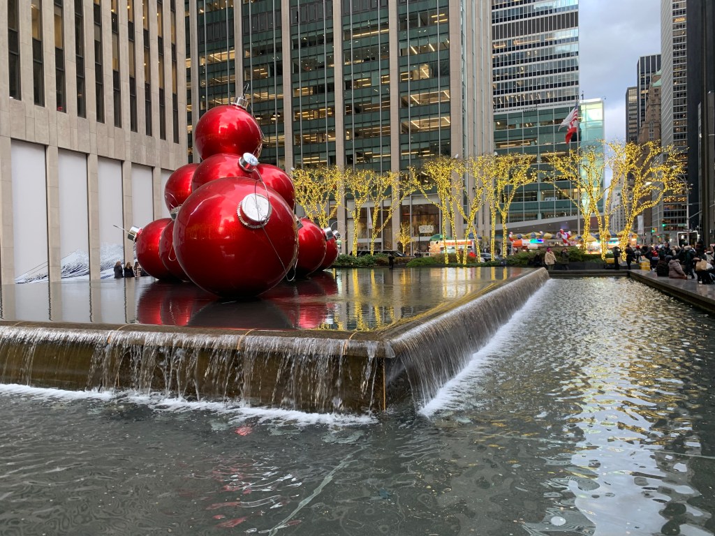 Das heutige Fotorätsel zeigt gigantischen roten Christbaumschmuck, den jemand in einem Brunnen an der Straße hat liegen lassen, vielleicht nach dem Besuch des Holiday Markets am Columbus Circle, den ich nachher noch aufsuchen will. Ob die Kugeln für einen dieser großen Weihnachtsbäume in der Stadt bestimmt waren? Das würde passen. Wo finden sich die Kugeln?